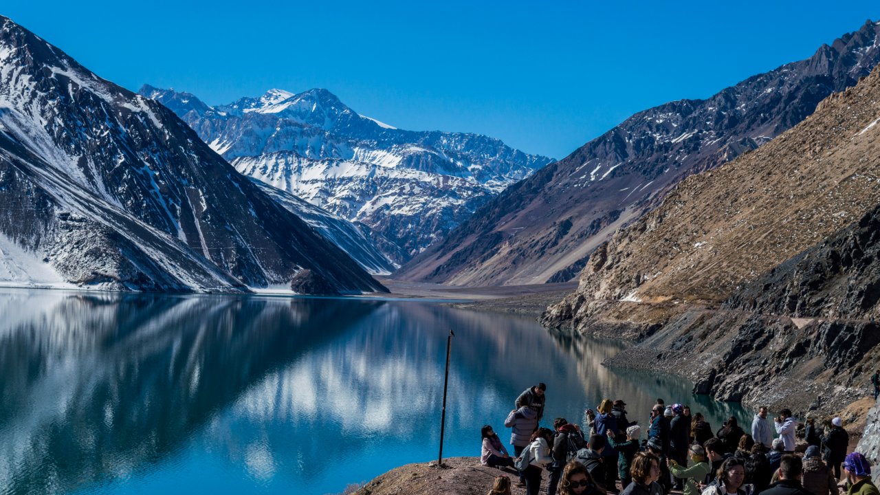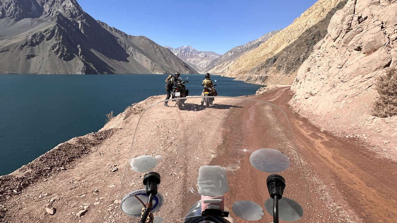 With spirits high, we roll deeper into the valley. The road twists through roaring rivers, snow-dusted peaks, and tunnels carved into the mountains — remnants of the region’s old railway. At over 2,000 meters, the shimmering turquoise waters of Embalse El Yeso await us, framed by the raw beauty of the Andes.